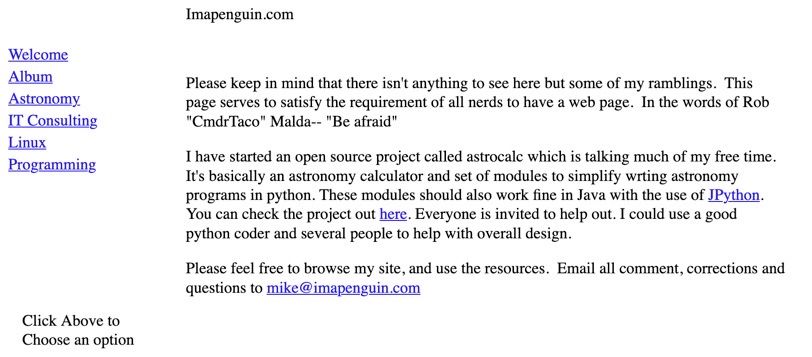 I checked the wayback machine and I found a terrible snapshot of Imapenguin.com from Feb of 2000, so it’s been at least 20 years I’ve had this domain.