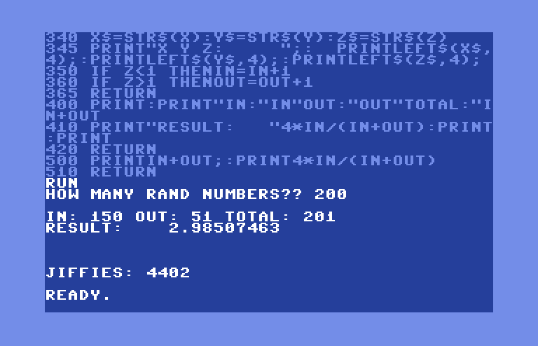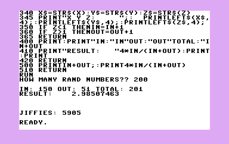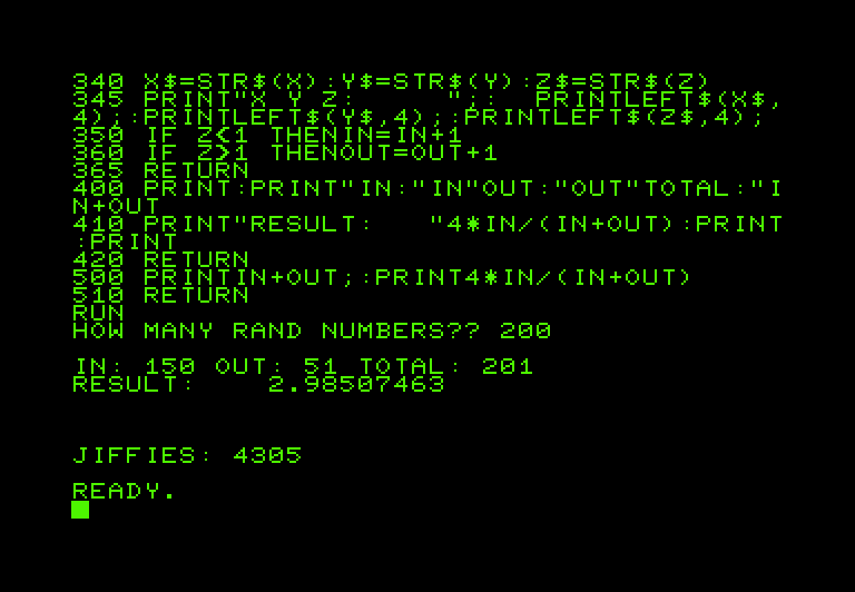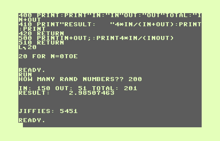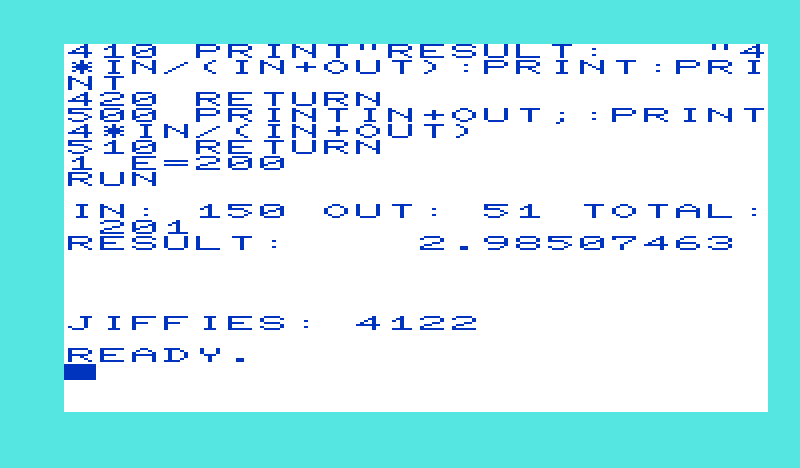 410 PRINT"RESULT:"4*IN/(IN+OUT):PRINT:PRINT