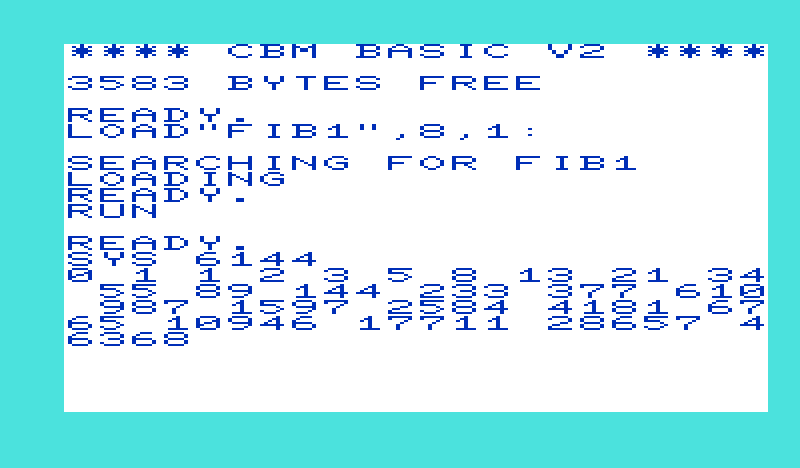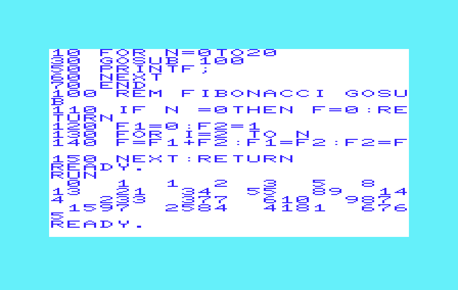 We need to get two values and add them to get a third. Lets try to use GOSUBs to organize our code so we can add stuff to our toolbox. You never know when you might need a Fibonacci series generator in BASIC. Could happen.