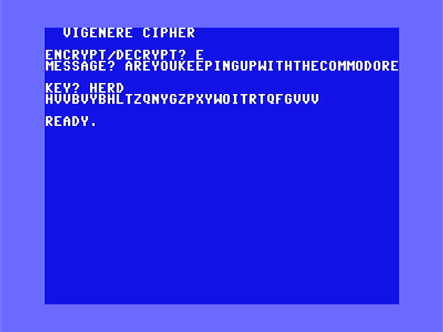 We will be doing these methods on the Commodore later in the series. We’ve still got several interesting ciphers to implement before we start doing more advanced code that cracking these will require.
