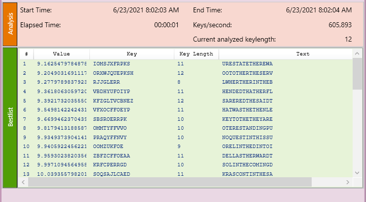 If you’ve not stumbled on Nils Kopal’s excellent and free Cryptool project I suggest you check it out. We’ll use it, and a modern computer (MacBook Pro 2020 version) to try and break this cipher. A couple million calculations per second make quick work of this one.