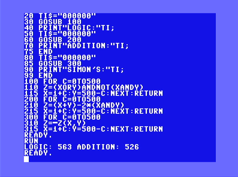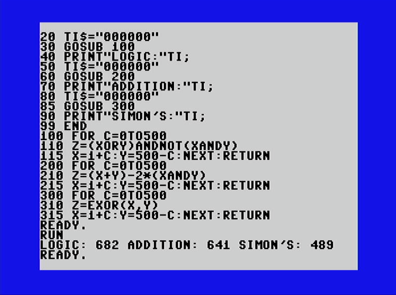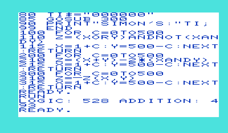 Just for fun, I compared 500 operations in each to see which is faster: pure logic, the addition method and Simon’s BASIC.