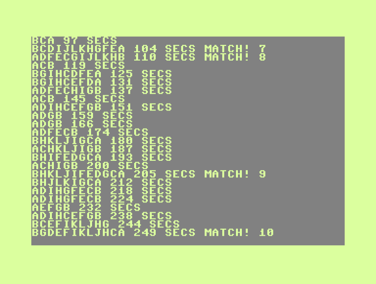 530 IFLEN(TR$)=12THENPRINT"MATCH!";:GOSUB600:PRINTCT:GOTO599