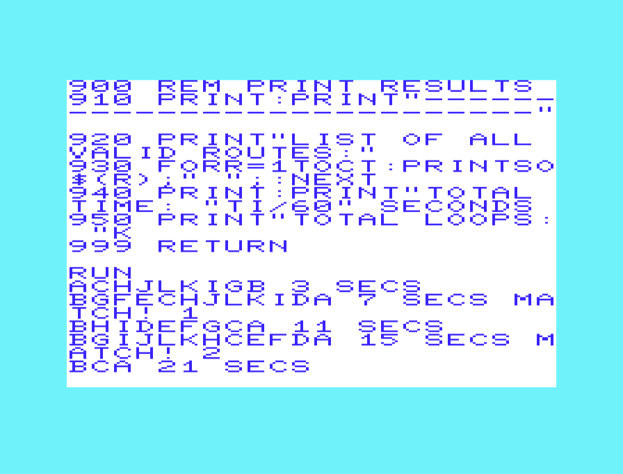 As always, my main goal is to do these problems with an unexpanded VIC-20 in mind. If I can get something down to 3583 bytes, I will. This runs quite well on the VIC, and except for the TI strings (to count the time passing), these should run on all 8 Bit Computers from the late 70s and 80s running similar BASIC implementations to this Microsoft BASIC 2.0.