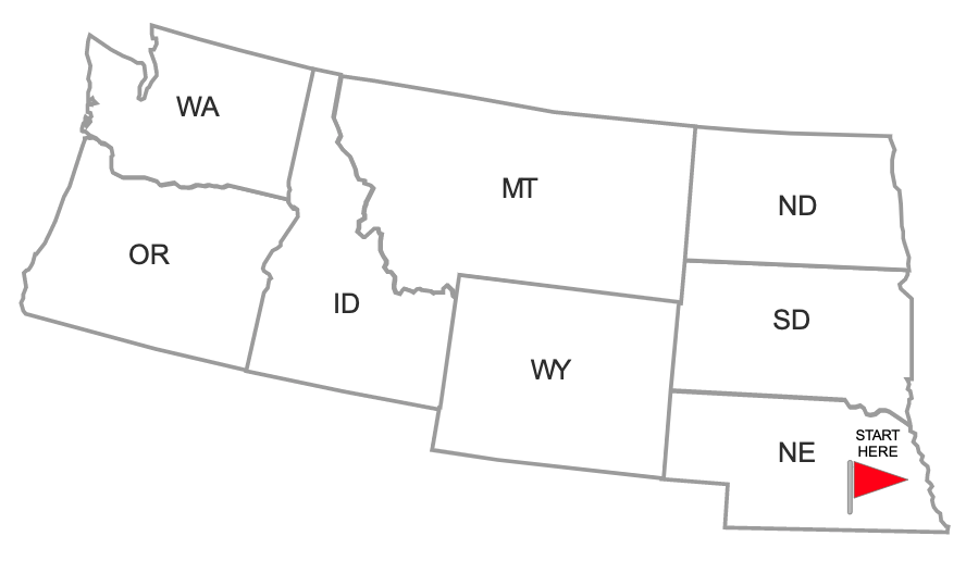 This week’s puzzle is about planning a road trip. You’ve flown to Omaha, Nebraska, and plan to rent a car and drive through each of the eight US states shows below: