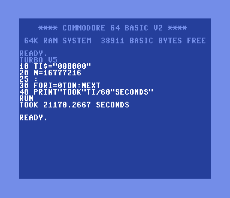 I happen to know that this same Machine Language routine with a byte added to count to 2^32 takes around 20 hours. I did it for the Terminator article research. You know, for science!
