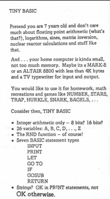 Anyway, the short version is that it fueled an effort that was already underway for several other BASIC implementations. TinyBASIC is the one we’ll be using today.