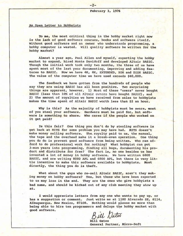 Back in 1976, he famously (infamously?) wrote a letter bemoaning what he saw as rampant piracy of BASIC. Micro Soft was selling their version of BASIC, which is quite good for a whopping $150. This was fine for a company, but to a "tinker in your garage" person, $150 ($760 or so in 2022) was pretty steep.