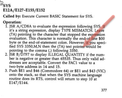 If we go back to Tool Kit BASIC p.377 to look at how SYS works.