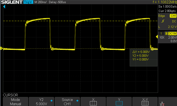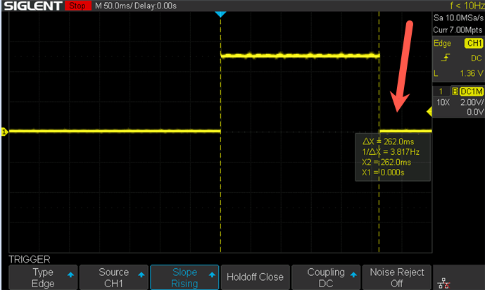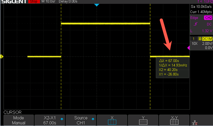 Then if we probe it with an oscilloscope, we can measure the 1+ minute square wave.