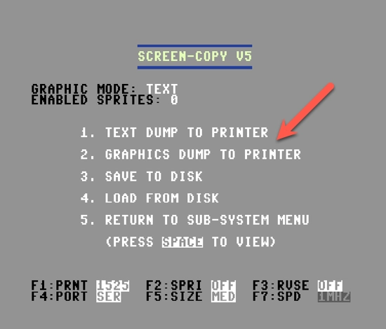 There isn’t a great way to print high-resolution screens from a Commodore. But if we use the Super Snapshot Cartridge, there’s a screen copy and print function there.
